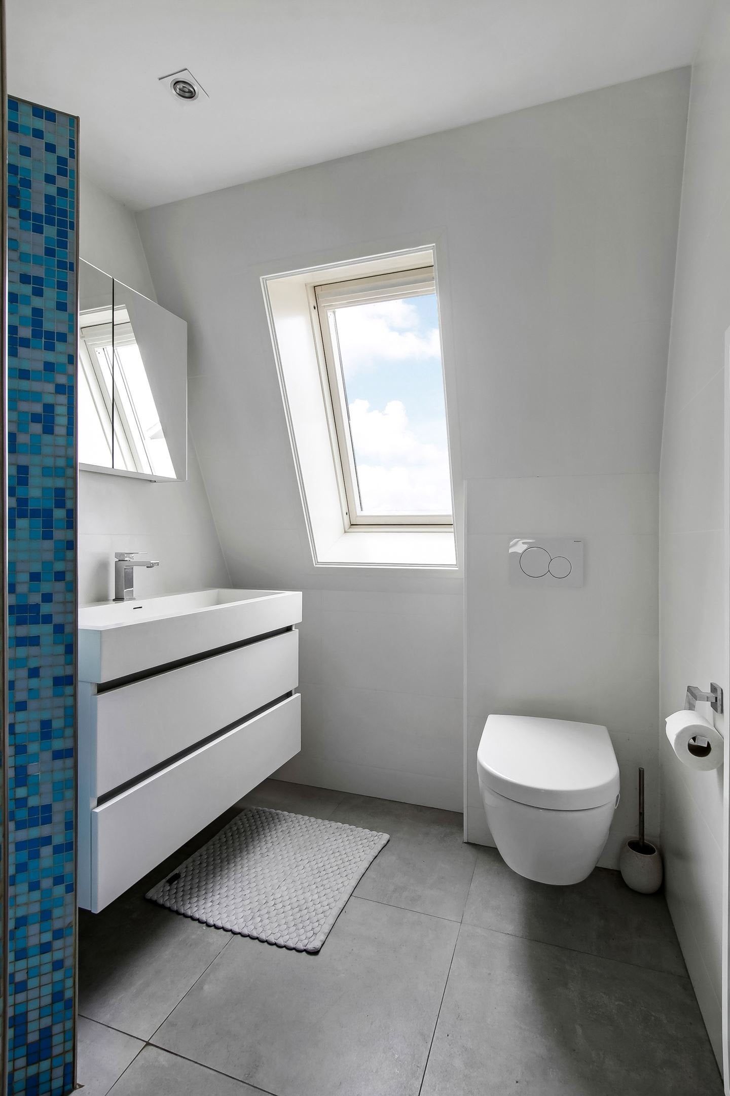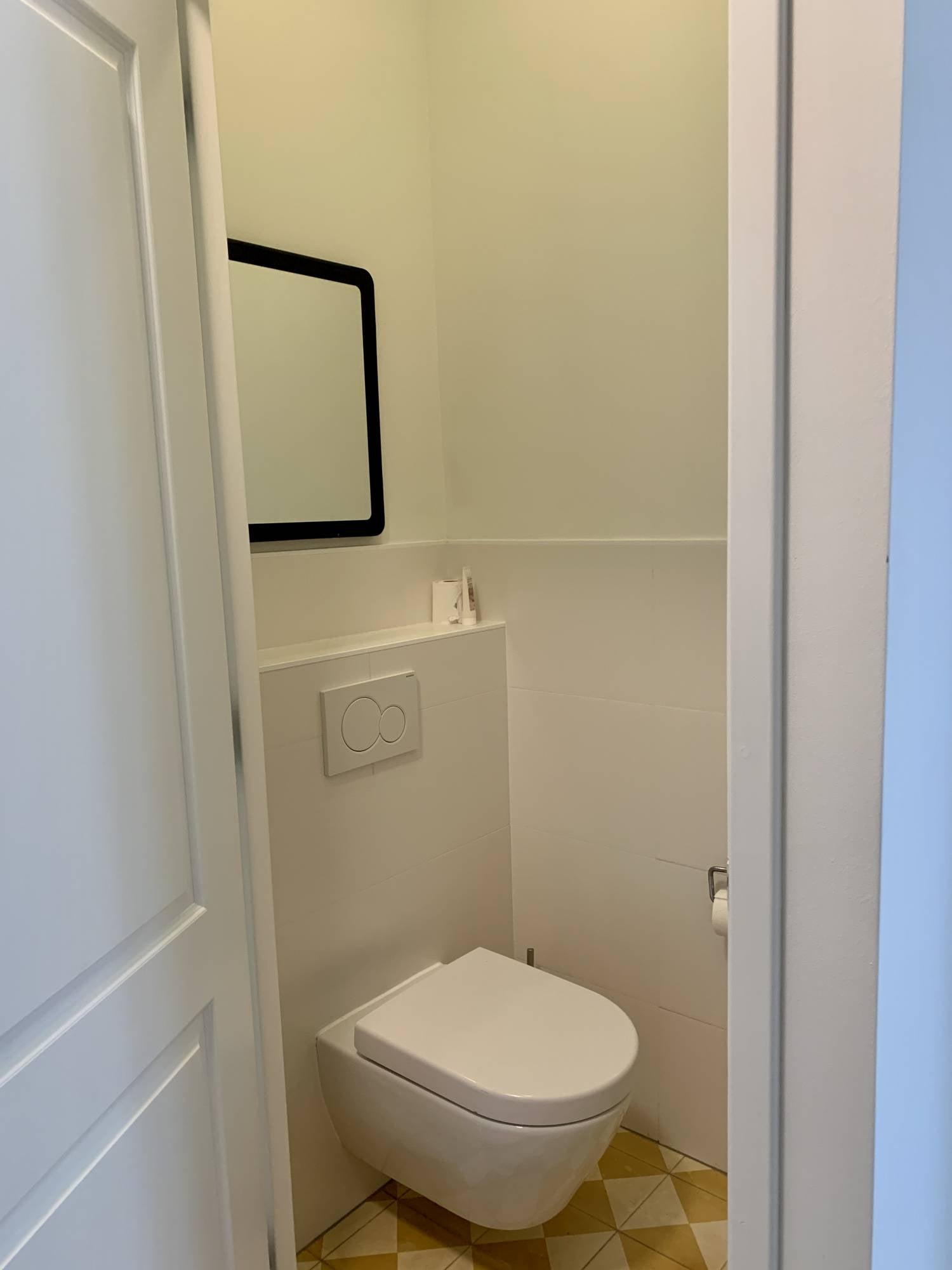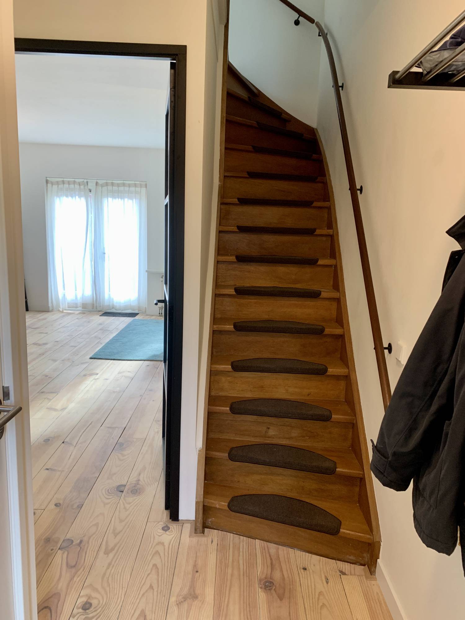 The first floor is equipped with high quality PVC floor. The master bedroom is fitted with queen-size bed and has a south facing balcony. A second bedroom is currently used as a studio while the third small bedroom can be configured as needed: a second studio or a walk-in wardrobe, also perfect for a child. Next to this room we find a hidden space for the washing machine/dryer and boiler (2024). The bathroom has a walk-in shower, wash basin with drawers, toilet, and a towel radiator.