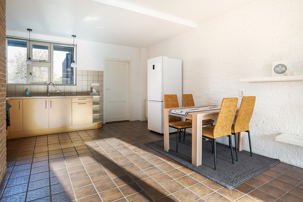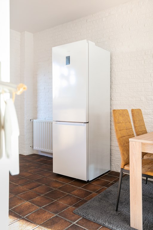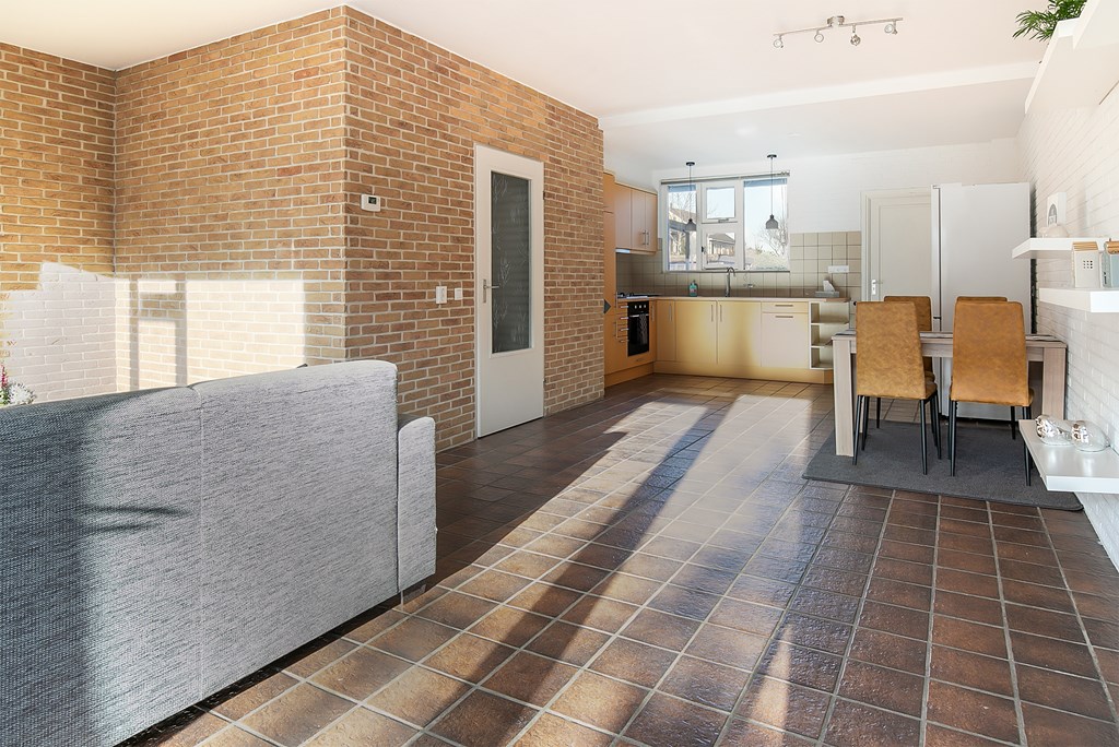 Aan de voorzijde bevindt zich de recent gerenoveerde L-vormige keuken, uitgerust met een vrijstaande koelkast, oven, 4-pits gaskookplaat en afzuigkap. Aangrenzend ligt de bijkeuken/wasruimte met vaatwasser en een deur naar de voortuin. De gehele begane grond is voorzien van een tegelvloer.