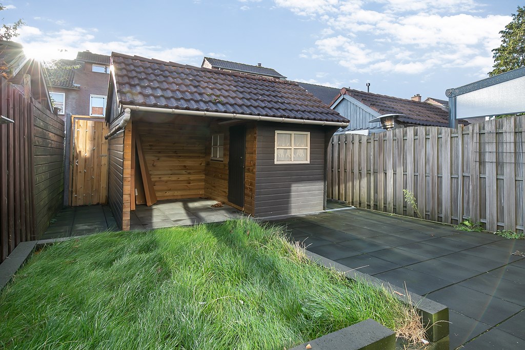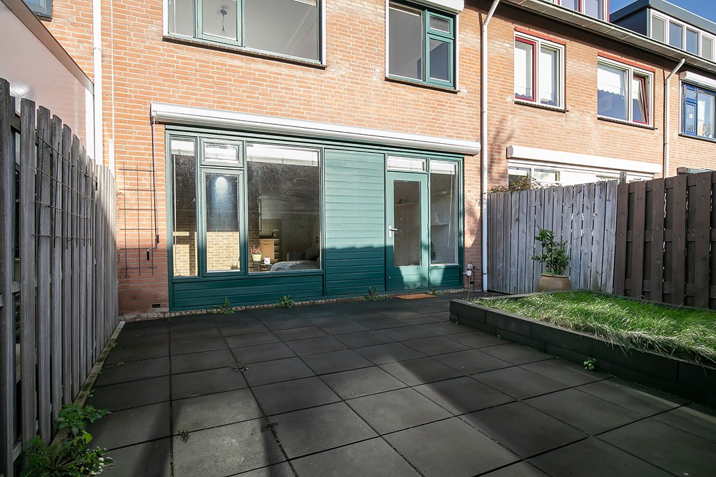 De goed onderhouden zuid-gerichte tuin biedt volop zon en privacy. De tuin beschikt over een houten schuur met luifel, bestrating, borders, zonnescherm, buitenkraan, omheining en een achterom. Privéparkeergelegenheid is aanwezig op eigen terrein.