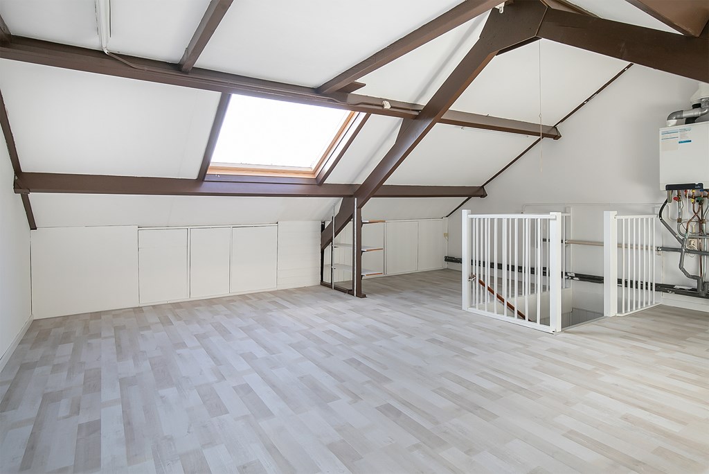 Bereikbaar via een vaste trap. Hier vindt u de cv-ketel, wasmachineaansluiting, mechanische ventilatie-unit, een gootsteen en praktische bergruimte achter de knieschotten. Daarnaast is er een ruime derde slaapkamer met dakraam en extra bergruimte op de vliering, voorzien van een was-/droogcombinatie.