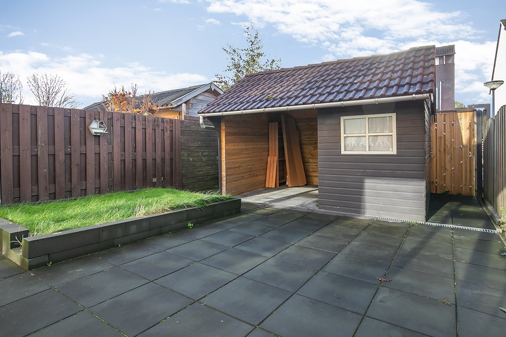 De goed onderhouden, zonnige tuin op het zuiden beschikt over een houten schuur met luifel, bestrating, border, zonnescherm, buitenkraan, omheining en een achterom.