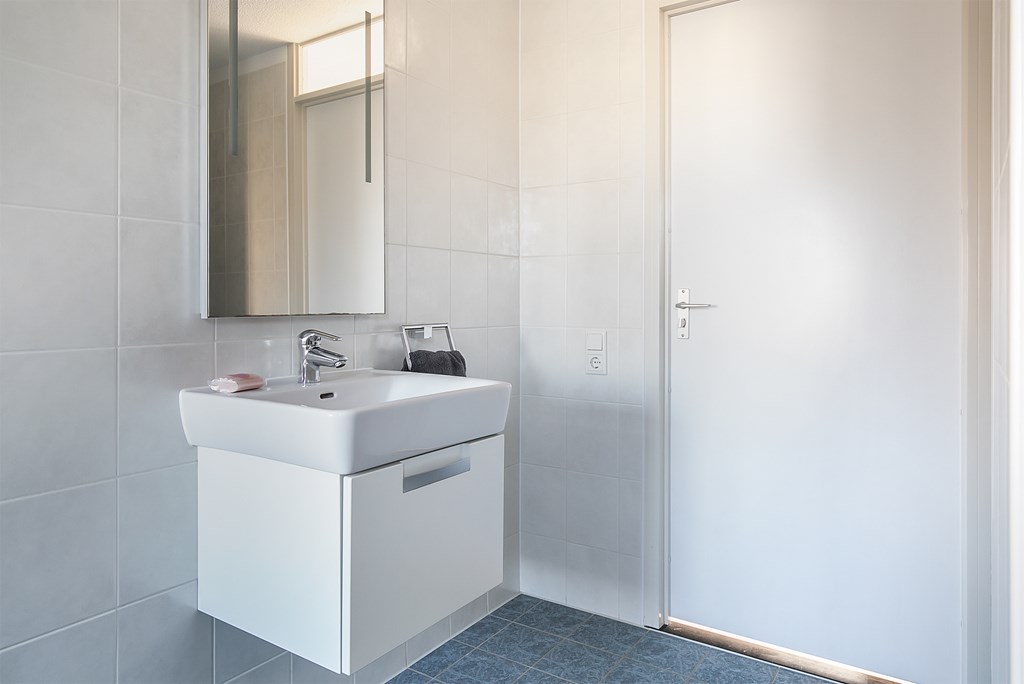 De nette badkamer is compleet ingericht met een douche, ligbad, tweede toilet, wastafelmeubel, designradiator en een raam voor natuurlijke ventilatie. De verdieping is afgewerkt met laminaat.