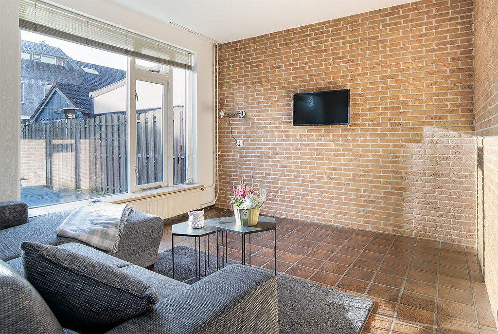 U komt binnen in een uitnodigende hal met garderoberuimte, meterkast, gastentoilet, trap naar de eerste verdieping en toegang tot de woonkamer. De ruime, tuingerichte woonkamer heeft een open woon-/eetgedeelte en is ingericht met een eettafel voor vier personen, een bankstel, salontafel en een aan de muur gemonteerde tv.