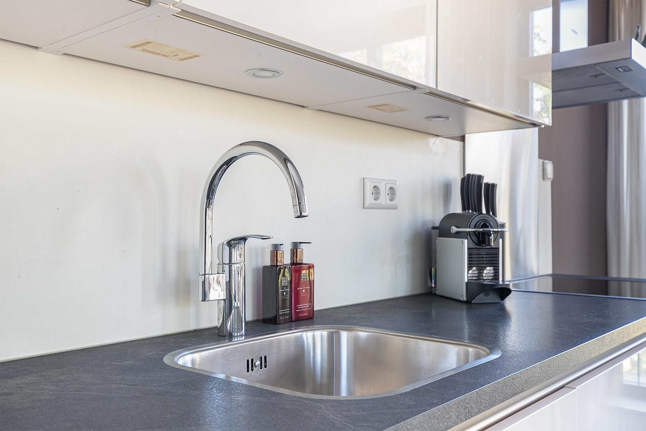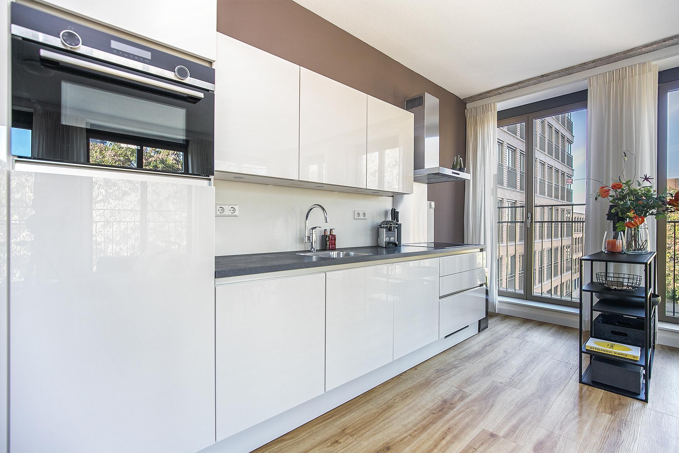 De *open keuken* is strak vormgegeven in wit en voorzien van hoogwaardige inbouwapparatuur: inductiekookplaat, combi-oven, vaatwasser en afzuigkap.