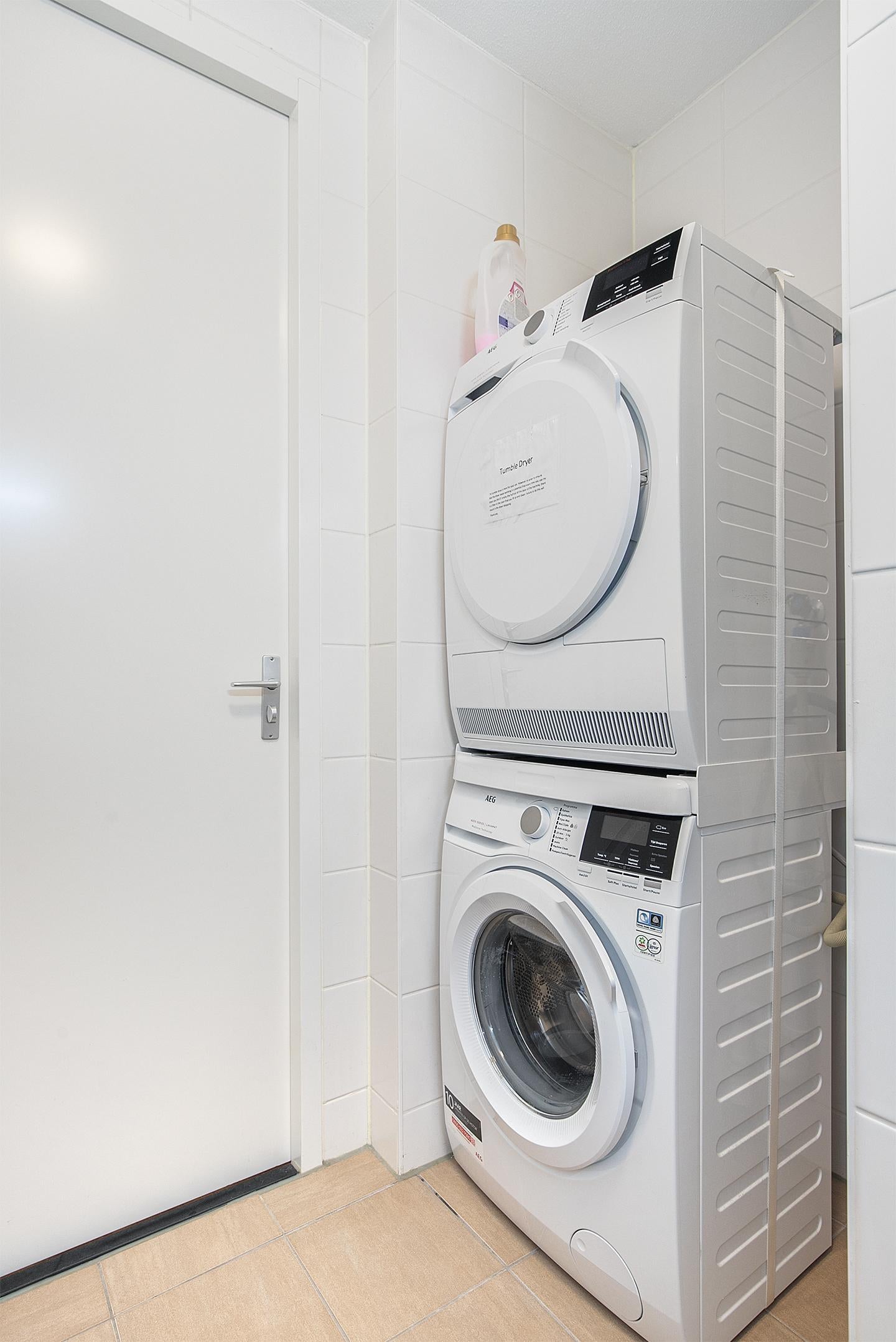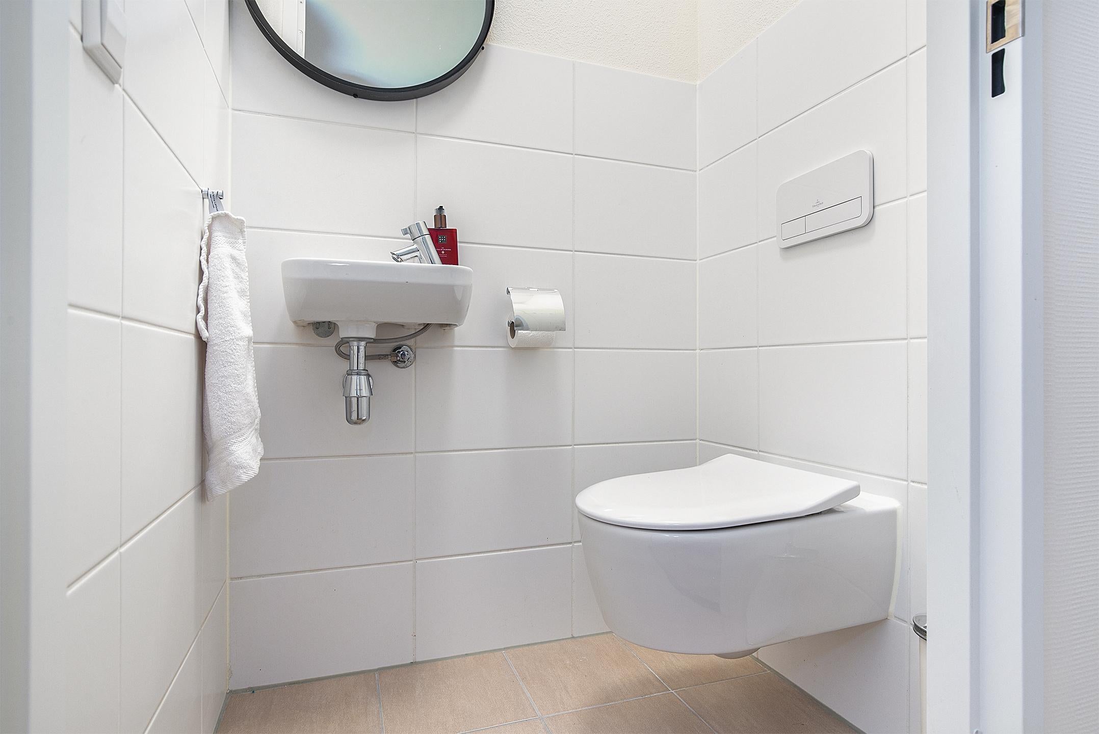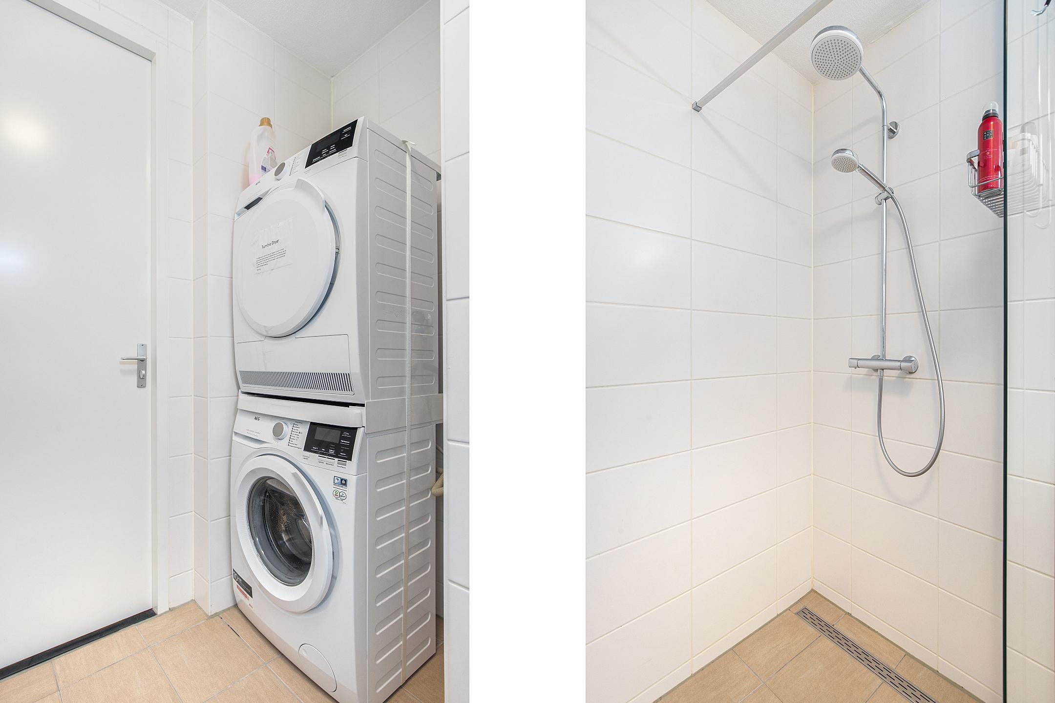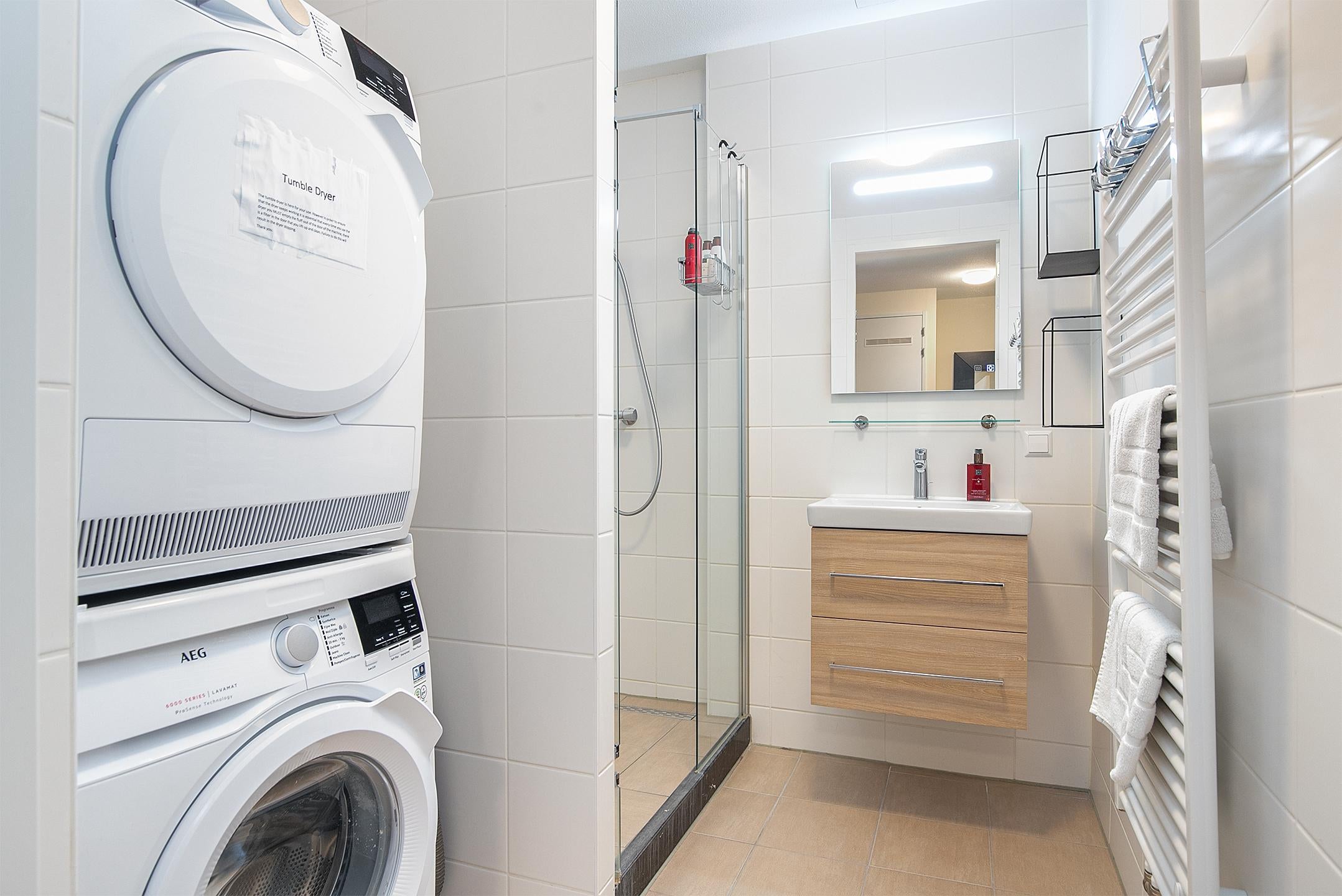 De *moderne badkamer* is uitgerust met een regendouche, wastafelmeubel met spiegelverlichting, designradiator en een was-/droogcombinatie.