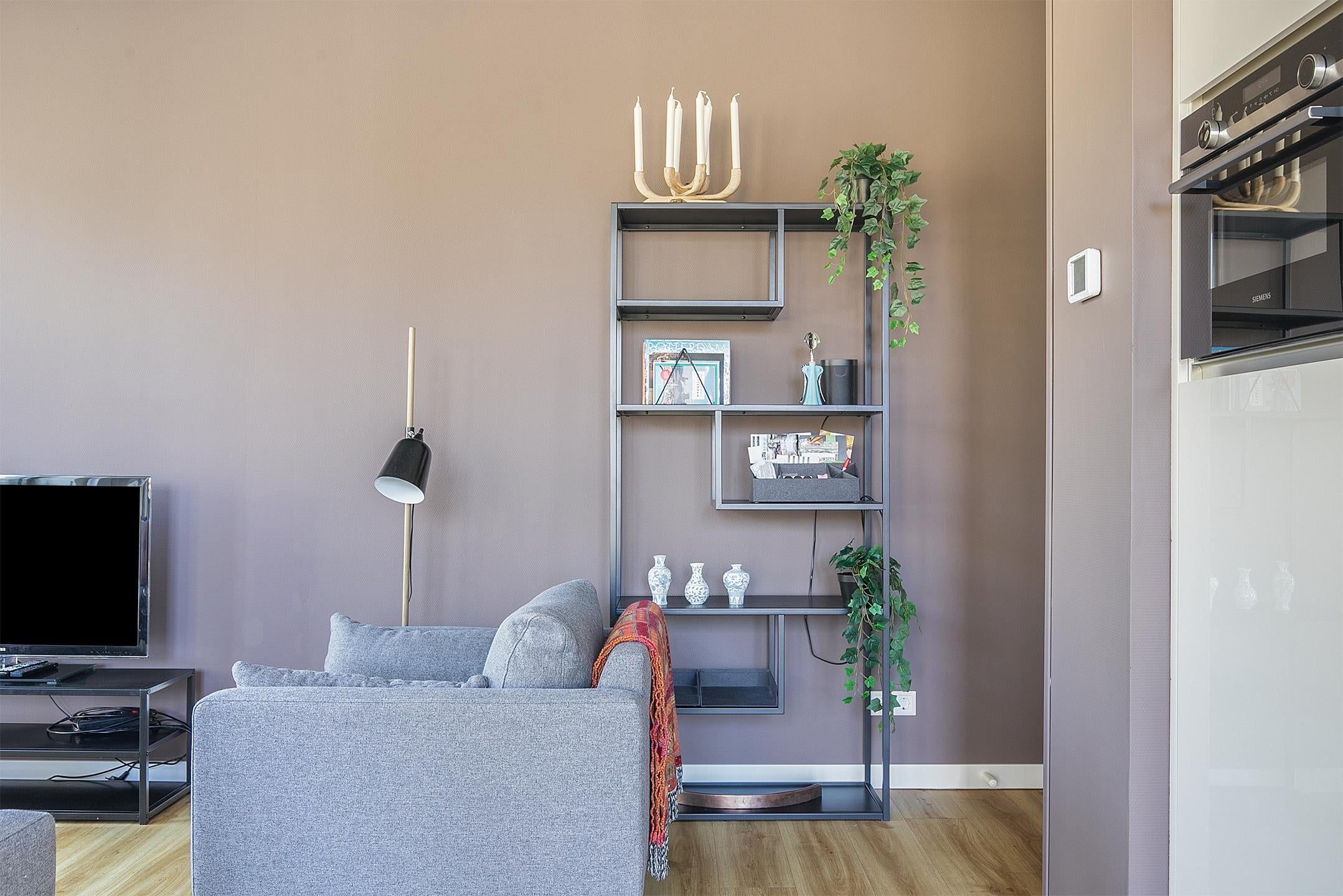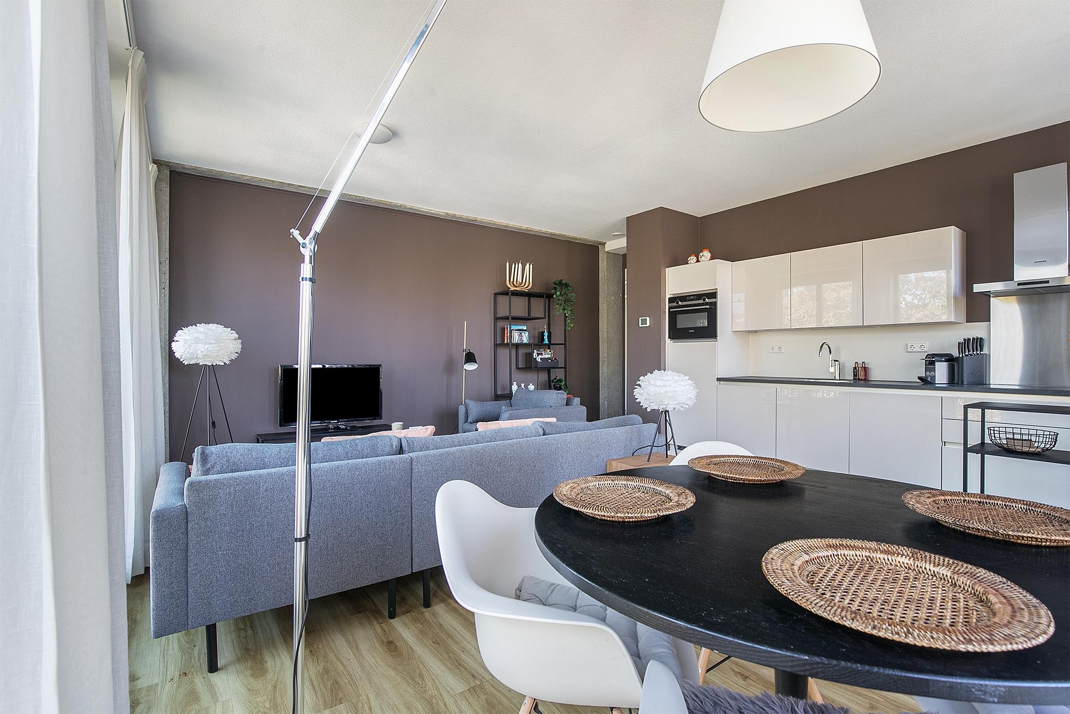 De *lichte woonkamer* met fraaie houten vloer biedt een comfortabele zithoek met moderne bank, televisie en eettafel met vier stoelen.