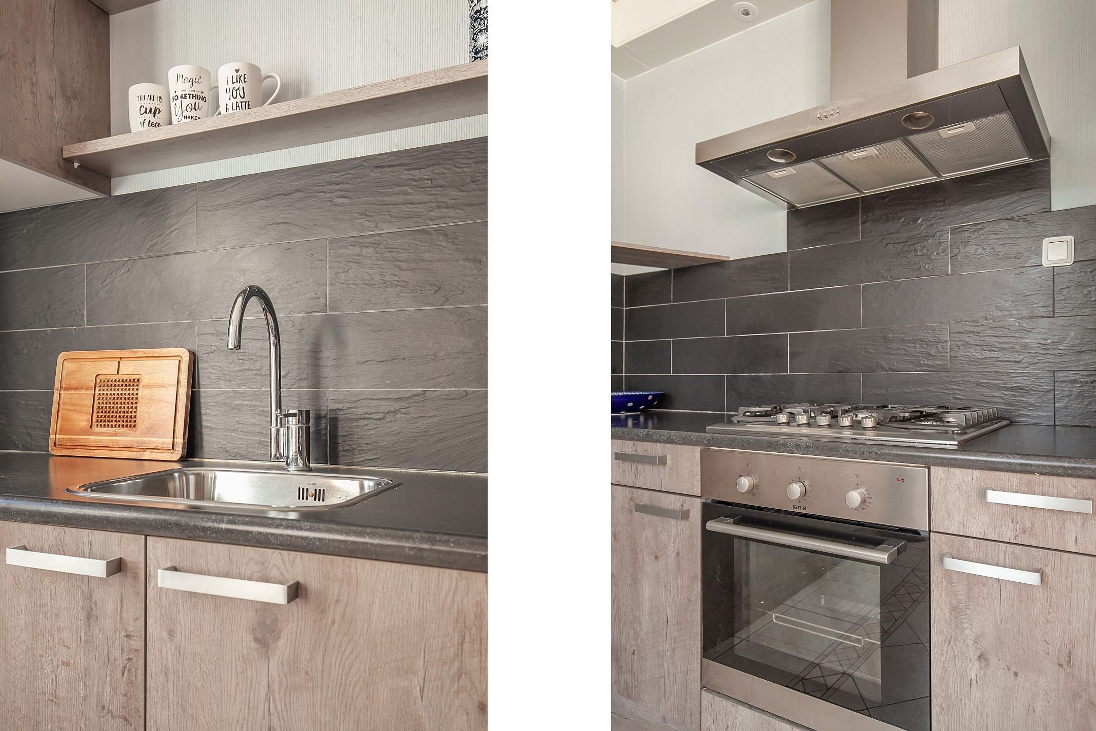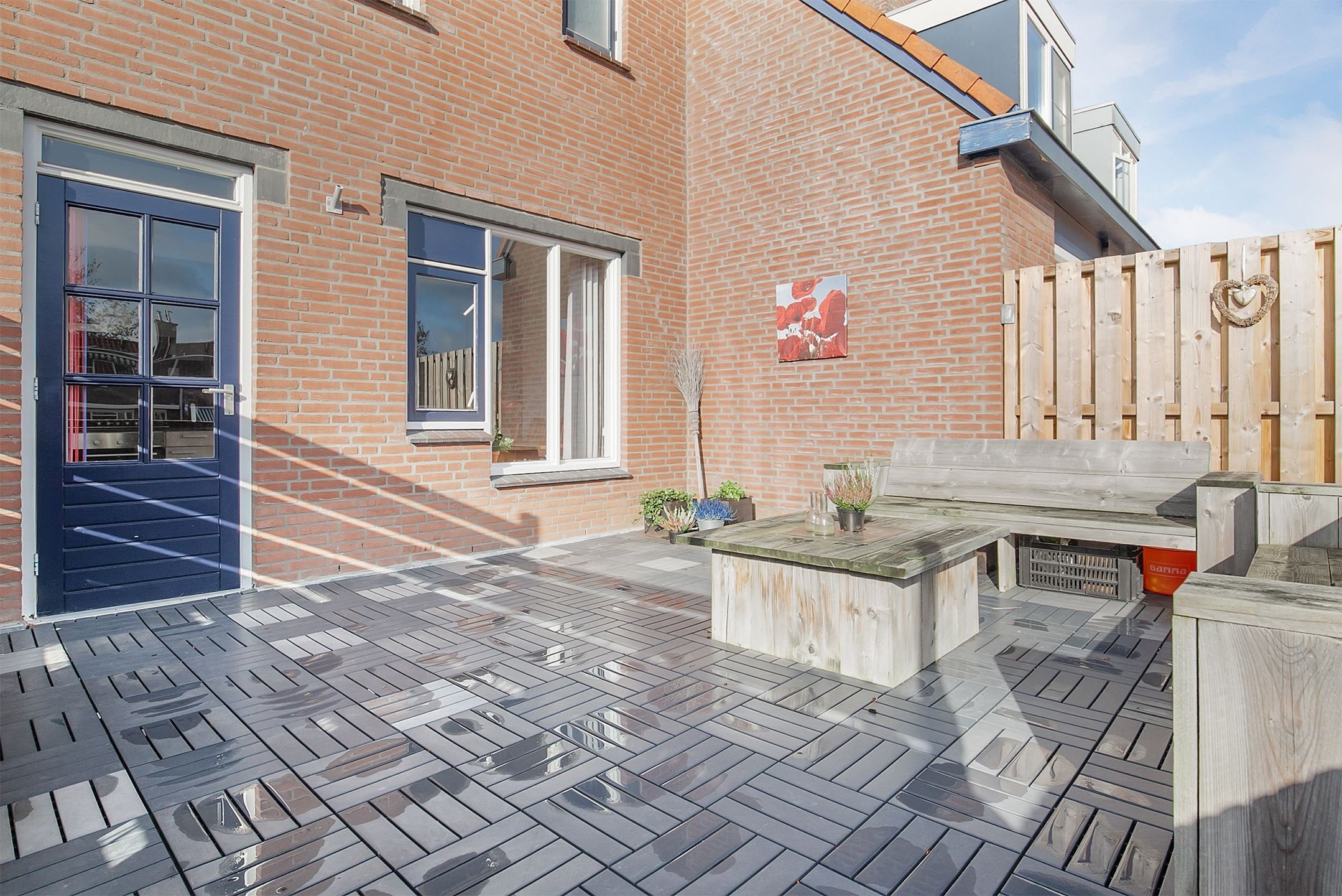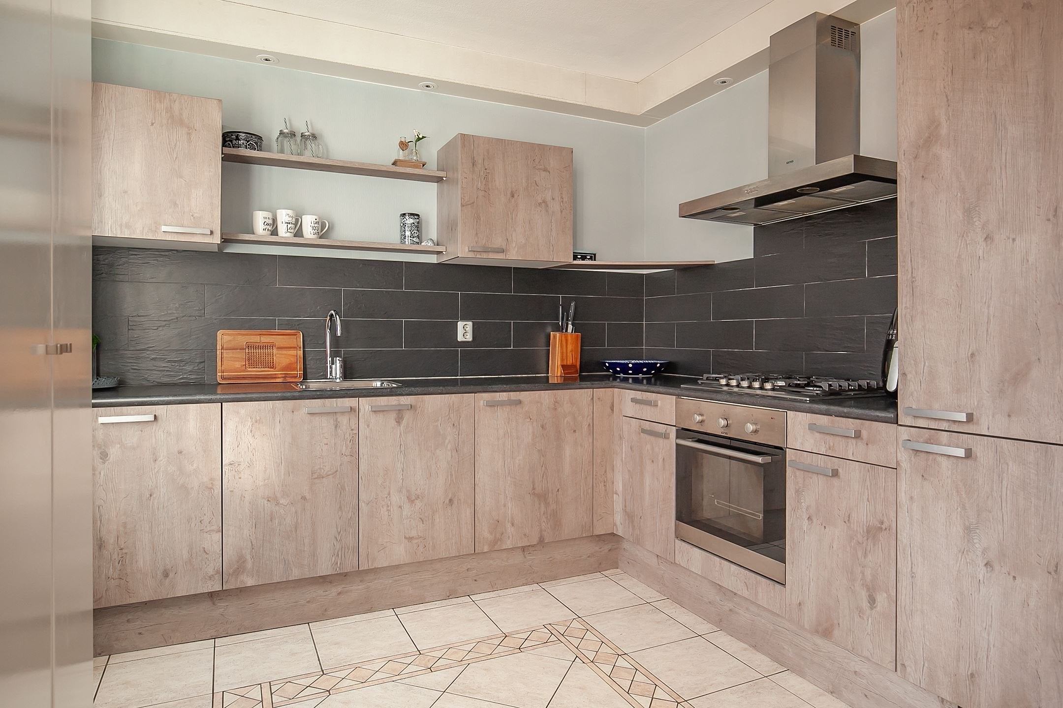 Entree/hal met meterkast en toegang tot de ruime woonkamer aan de voorzijde, open trap naar eerste verdieping, deur naar tussenhal met keurig toilet en het eetgedeelte aan de achterzijde. De half open keuken bevindt zich aan de achterzijde en is v.v. een moderne hoekopstelling 2018 met diverse inbouwapparatuur o.a. 5 pits gaskookplaat, afzuigkap, oven, koelkast, vriezer, vaatwasser en spoelbak. De woonverdieping is v.v. een nette plavuizenvloer en keurig afgewerkte wanden. Vanuit de keuken is er toegang tot het heerlijk ruime terras van 25m2 met moderne vlonders.