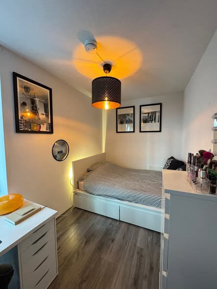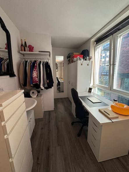 De kamer is een ruime kamer van ~12m2 met eigen wastafel. De huur bedraagt ongeveer €800 incl. De eerste maand betaal je een borg van €500. De kast en het bed dienen te worden overgenomen.