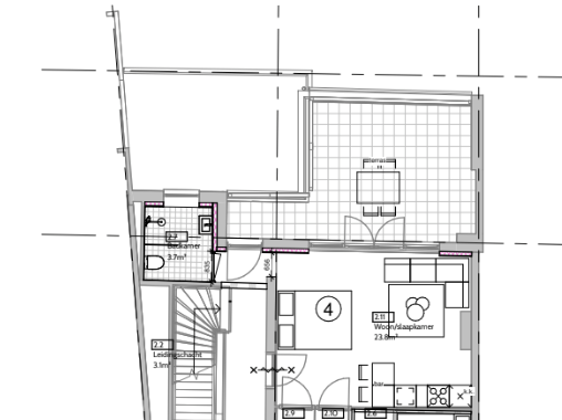 This studio is located at the 1th floor at the backside with a large private terrace.